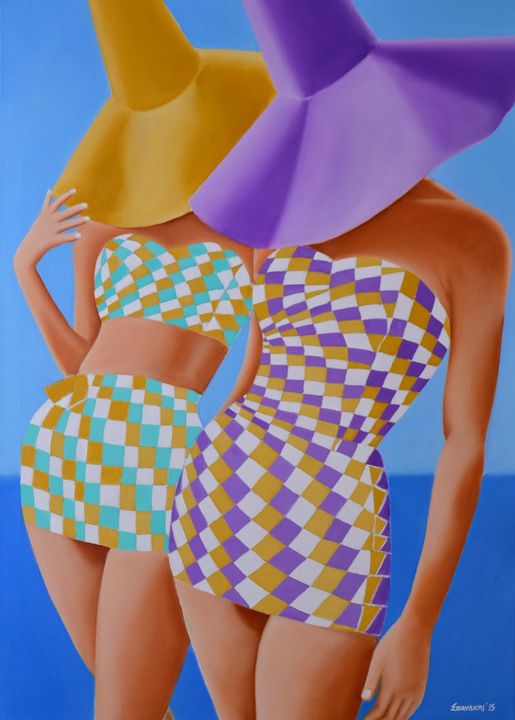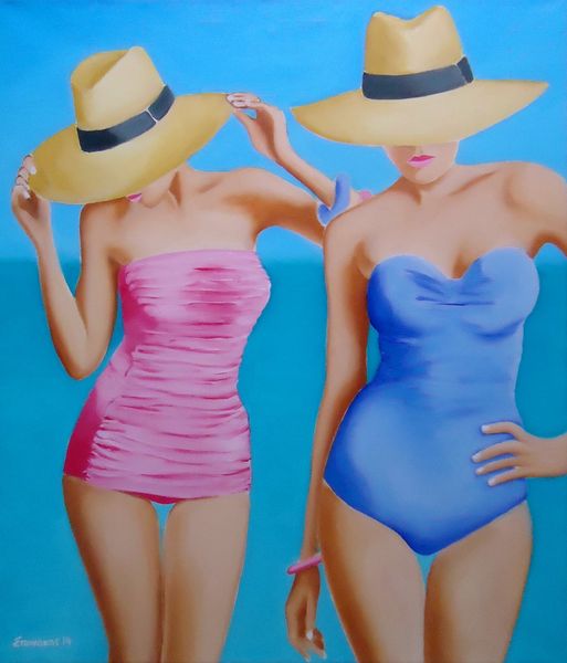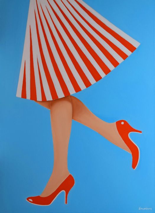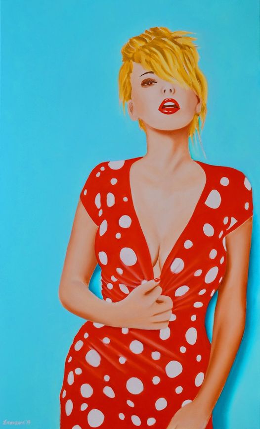 Η τεχνοτροπία του θυμίζει ποπ-αρτ, αλλά και τις διαφημίσεις των δεκαετιών ’50-’60 με τα χαρούμενα κορίτσια και τα πολύχρωμα κομψά φορέματα.
